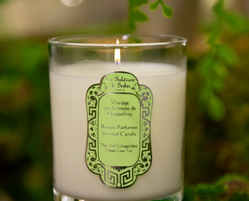 Doplňující produkty, Svíčky, Voyage sur la route de DarjeelingLuxusní svíčka La Sultane de Saba se svěží vůní přírodních tónů zeleného čaje a zázvoru.