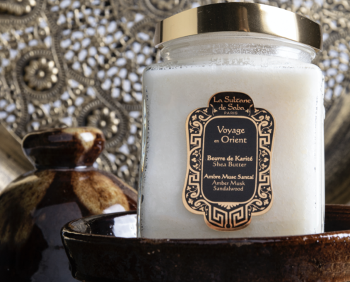 Másla Karité, Másla Karité, Péče o tělo, Péče o vlasy, Voyage en Orient100% máslo Karité La Sultane de Saba, delikátně provoněné přírodní esencí ambry, musku a santalu. Máslo Karité má regenerační a reparační účinky díky přirozenému obsahu vitamínů A, D, E a F. Máslo Karité zpevňuje, ochraňuje, vyživuje a zjemňuje pokožku. Nezbytné pro extrémně suchou pleť celého těla. 100% másla Karité La Sultane de Saba jsou zpracována v první kvalitě jakosti.