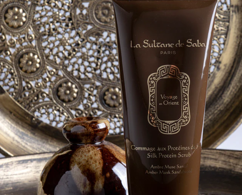 Dárky pro NI, Péče o tělo, Tělový peeling, Tipy na dárky, Voyage en OrientTělový peeling Ambre Musc Santal s proteiny hedvábí.