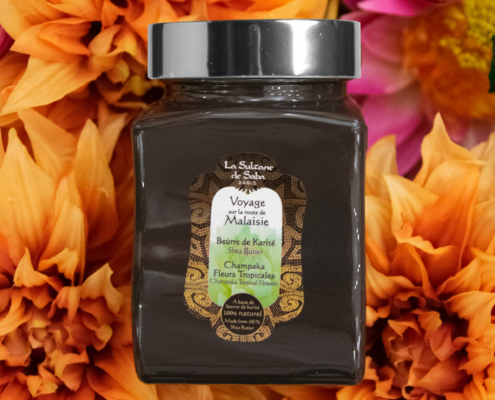 Másla Karité, Másla Karité, Péče o tělo, Péče o vlasy, Voyage sur la route de Malaisie100% máslo Karité La Sultane de Saba, delikátně provoněné přírodními esencemi tropických květů a magnólie Champaka. Máslo Karité má regenerační a reparační účinky díky přirozenému obsahu vitamínů A, D, E a F. Máslo Karité zpevňuje, ochraňuje, vyživuje a zjemňuje pokožku. Nezbytné pro extrémně suchou pleť celého těla. 100% másla Karité La Sultane de Saba jsou zpracována v první kvalitě jakosti.