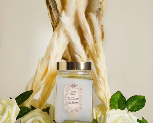 Péče o tělo, Tělový peeling, Voyage sur la route des DélicesNebeský tělový peeling z mořské soli a přírodních esenciálních olejů zbavuje pokožku odumřelých buněk, zanechává ji rozjasněnou, vyživenou, hydratovanou a delikátně provoněnou. Po jeho použití již není třeba nanášet další přípravky na hydrataci. Je vhodný pro všechny typy pleti.