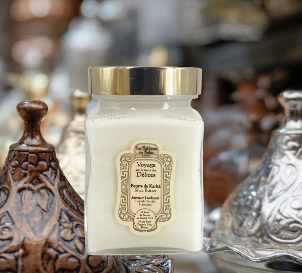 100% máslo Karité La Sultane de Saba, delikátně provoněné přírodními esencemi Loukoum, Turkish delights.  Máslo Karité má regenerační a reparační účinky díky přirozenému obsahu vitamínů A, D, E a F. Máslo Karité zpevňuje, ochraňuje, vyživuje a zjemňuje pokožku. Nezbytné pro extrémně suchou pleť celého těla. 100% másla Karité La Sultane de Saba jsou zpracována v první kvalitě jakosti.